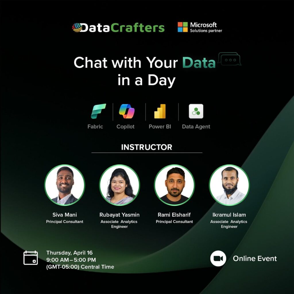 Join us in Houston for a full-day, in-person Chat with Your Data in a Day workshop, hosted by Data Crafters in collaboration with Microsoft.