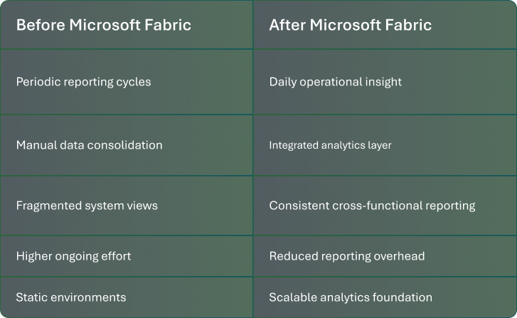 Fabric enabled data from sales, production, inventory, and finance to be integrated into a single analytics environment while operational systems continued to run without disruption.