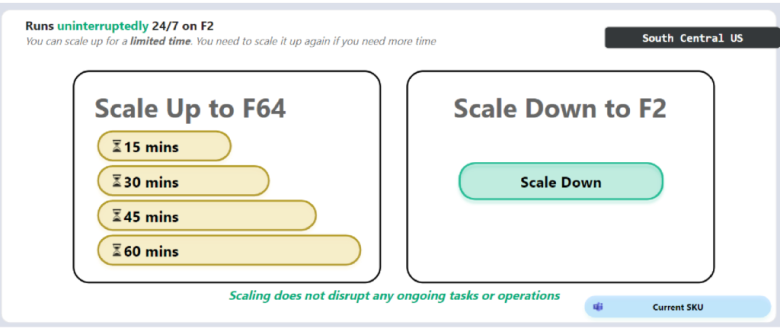 Also, if there’s need to scale up when you need more computing power, you can scale up the capacity for a certain period. For example, in one scenario, we scheduled refresh time for some semantic models in the same time frame. The F2 capacity is not enough to complete all the refresh, then we used logic apps to schedule capacity up to F64 time for 1 hour and now the operation runs smoothly without having to pay for the full reservation cost for F64 capacity. Also, the cost is the deduction of F2 reserve cost from F64 cost for that particular time.